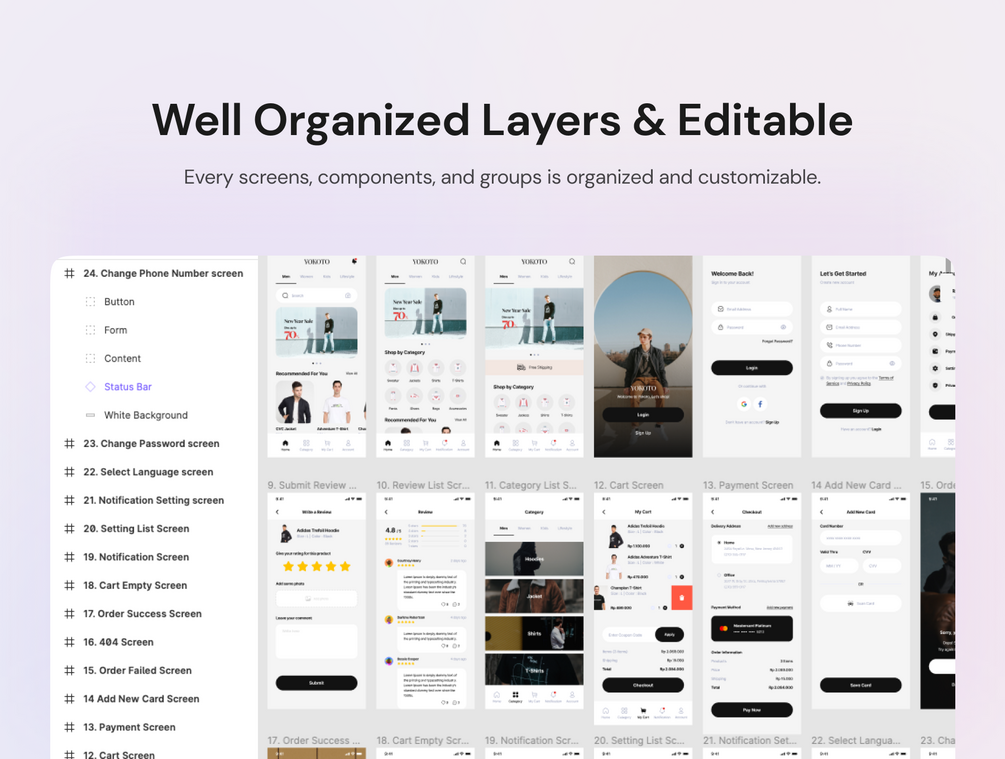 Including more than 40 screens with light and also dark modes, Yokoto will be a powerful and useful asset for you to powering your design and also increase your workflow speed.